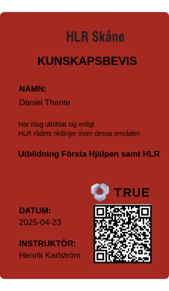 Alla TRUE -document är säkrade med blockchain-teknologi och kan verifieras som äkta. Klicka på verifieringsknappen bredvid dokumentet eller skanna QR-koden med din smartphones kamera. Ingen app krävs - dokumentets äkthet verifieras omedelbart.
