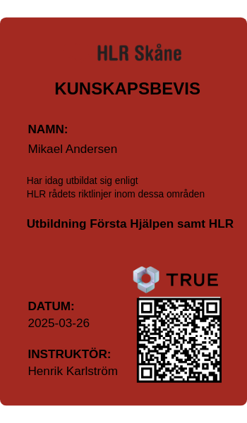 Alla TRUE -document är säkrade med blockchain-teknologi och kan verifieras som äkta. Klicka på verifieringsknappen bredvid dokumentet eller skanna QR-koden med din smartphones kamera. Ingen app krävs - dokumentets äkthet verifieras omedelbart.